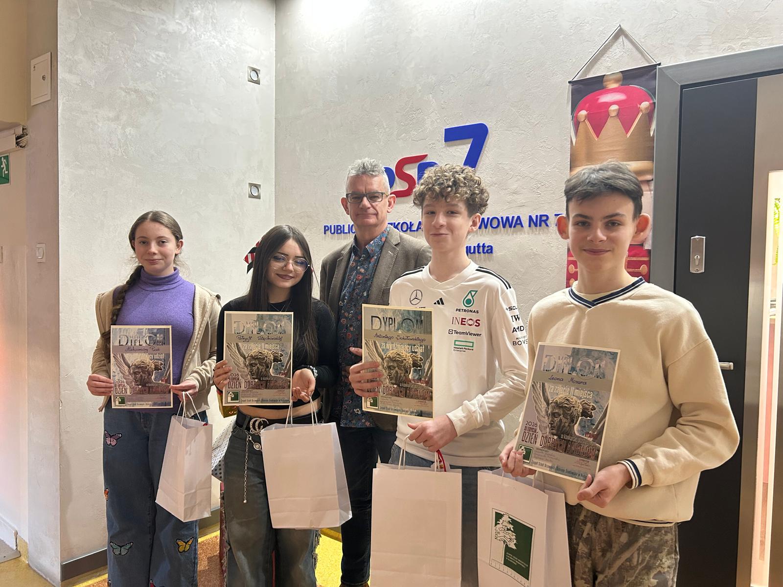 W konkursie plastycznym uczniowie klasy 8a — Patrycja Więckowska i Leon Mosur — zdobyli II miejsce ex aequo, a wyróżnienie otrzymał Antek Sokołowski.