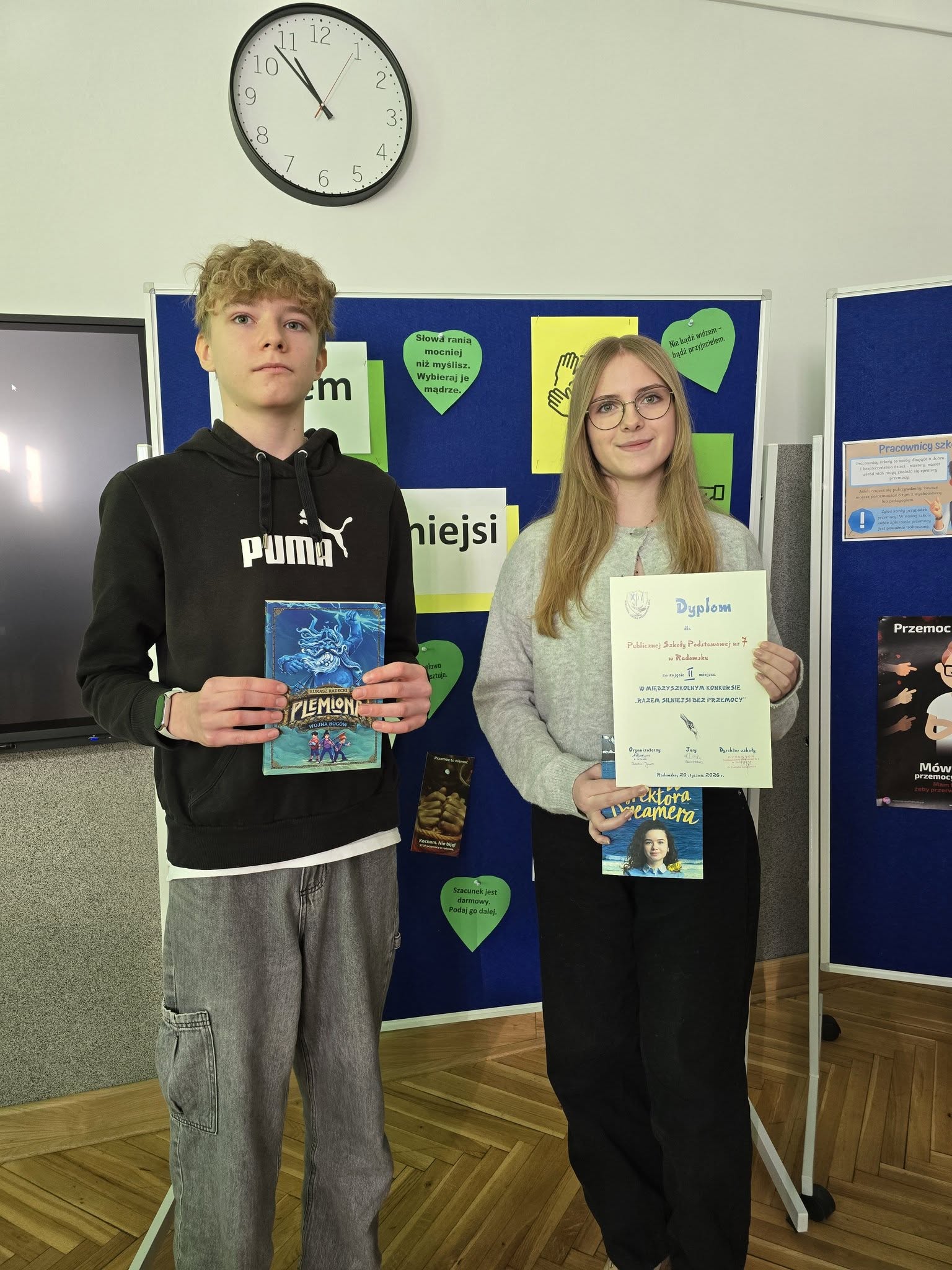 Uczniowie klasy 7b Blanka Nowińska oraz Jakub Sewerynek, zdobyli II miejsce w międzyszkolnym konkursie profilaktycznym "Razem silniejsi bez przemocy", poświęcony problematyce przemocy rówieśniczej.