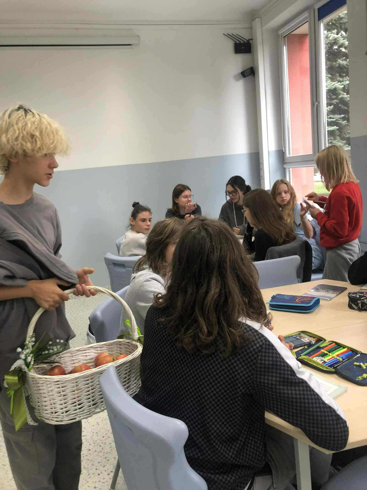 Samorząd Uczniowski Siódemki także promuje zdrową żywność rozdając całej społeczności szkolnej pyszne, soczyste, a przede wszystkim zdrowe jabłuszka.