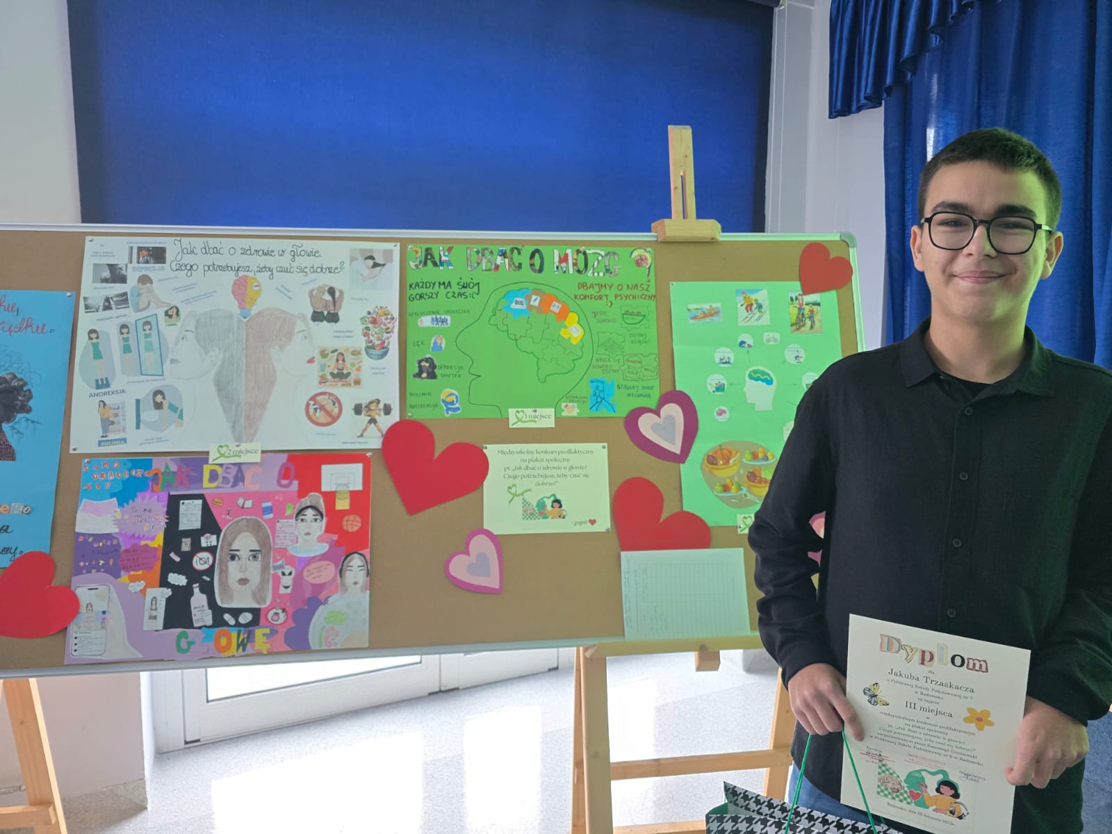 Bardzo miło nam poinformować, że Jakub Trzaskacz, uczeń klasy 8a zdobył 3 miejsce w międzyszkolnym konkursie profilaktycznym na plakat społeczny "Jak dbać o zdrowie w głowie? Czego potrzebujesz, żeby czuć się dobrze?"