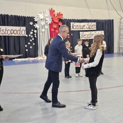 Na zakończenie uroczystości pan dyrektor wręczył nagrody zwycięzcom konkursu patriotycznego, który adresowany był do uczniów klas 4-8 z PSP nr 7. Zadaniem uczestników było przygotowanie projektu muralu lub plakatu na temat „Niepodległa Polska”.