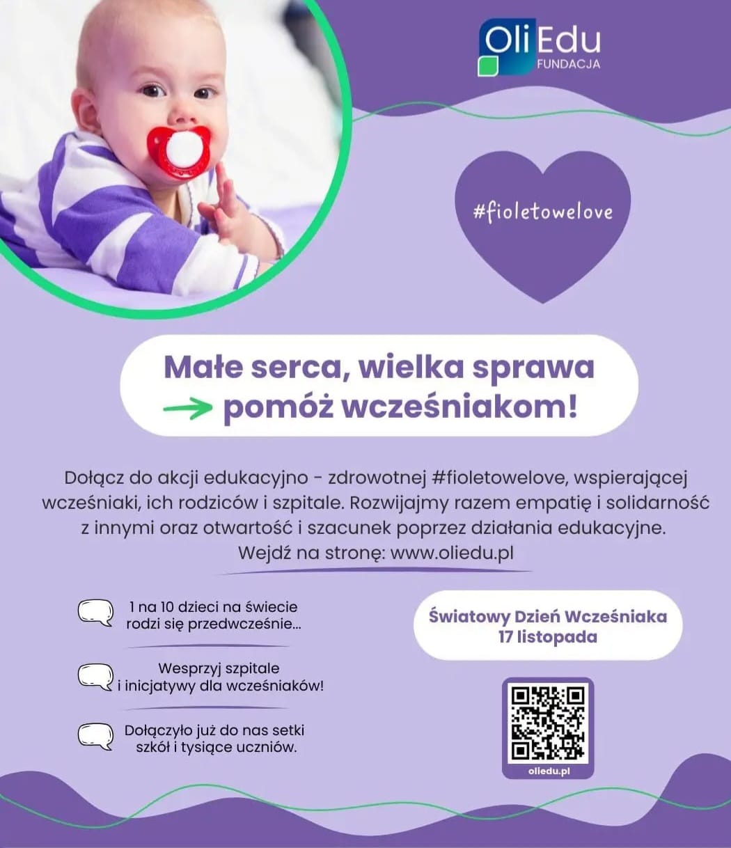 W poniedziałek, 17 listopada obchodzimy w naszej szkole wyjątkowy dzień — dzień solidarności z wcześniakami w ramach akcji Fioletowe Love, organizowanej przez Fundacja Edukacji Obywatelskiej OliEdu z okazji Światowego Dnia Wcześniaka.