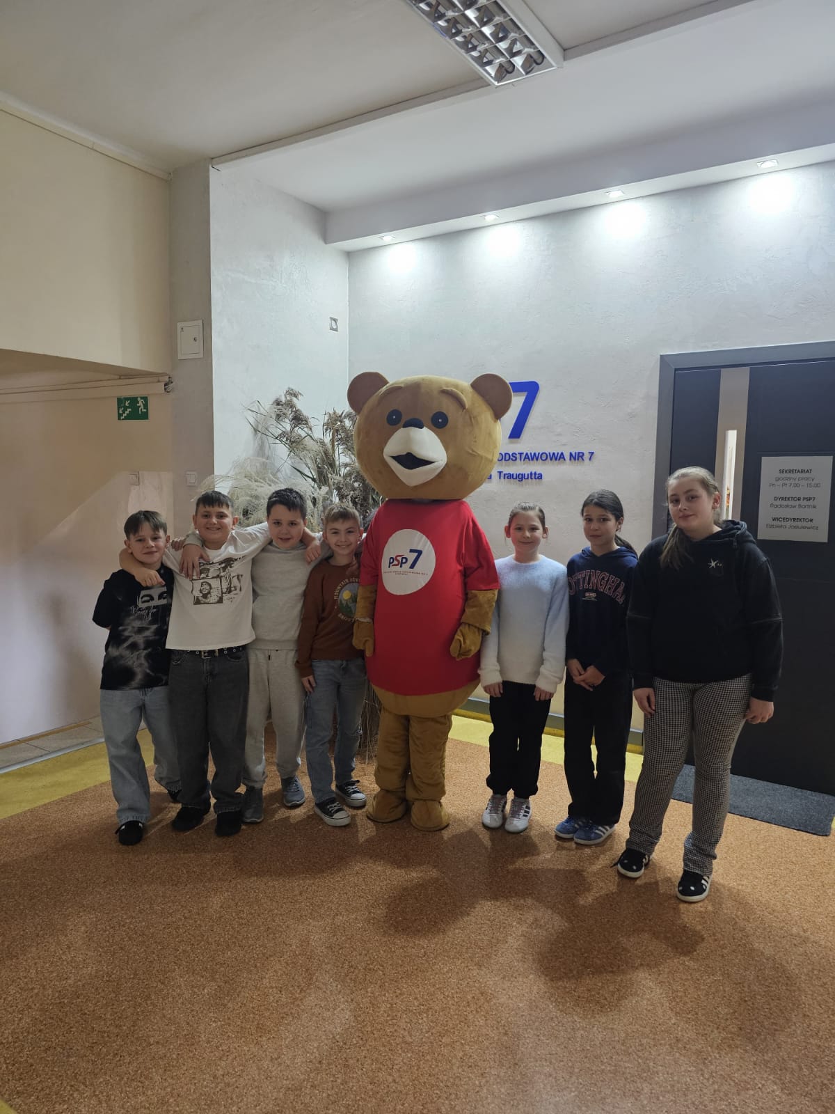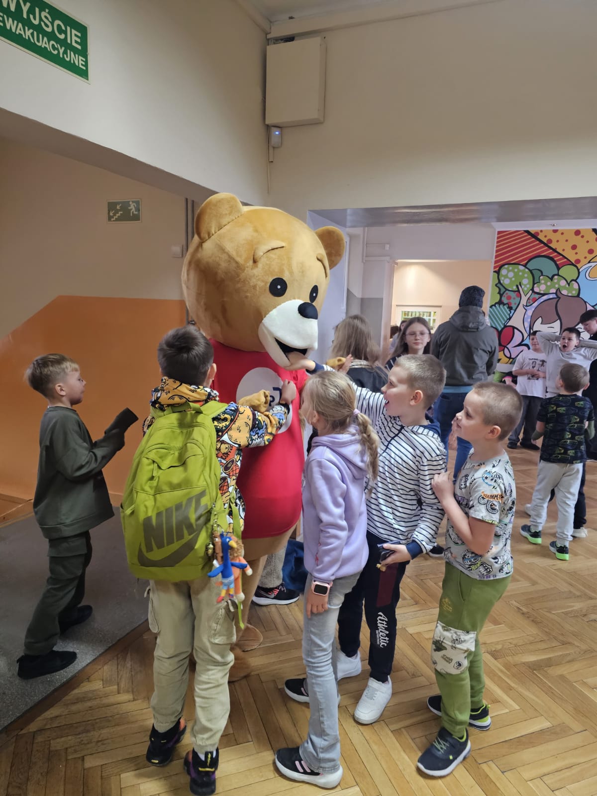 Podczas przerw w szkolnych korytarzach panowała cudowna, ciepła atmosfera. Wszyscy tłumnie przychodzili, aby przytulić się do Misia Traugusia, zrobić z nim zdjęcie i podzielić się uśmiechem.