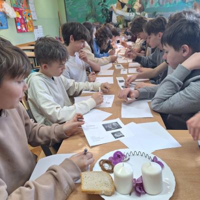 Dotyczyła znajomości dramatu romantycznego Adama Mickiewicza. Na każdym stoliku położona została karteczka z zadaniem.Po upływie konkretnego czasu (1,5 – 2 min) na hasło: PRZESIADKA, każdy uczeń przesiada się o jedno krzesełko i tak aż dojdzie do miejsca, które zajmował na samym początku. Takie zajęcia na pewno pozostaną na długo w pamięci naszych uczniów, będą lekcją koncentracji i samodyscypliny a także świetnym sposobem na utrwalenie wiedzy z “Dziadów cz. II”.