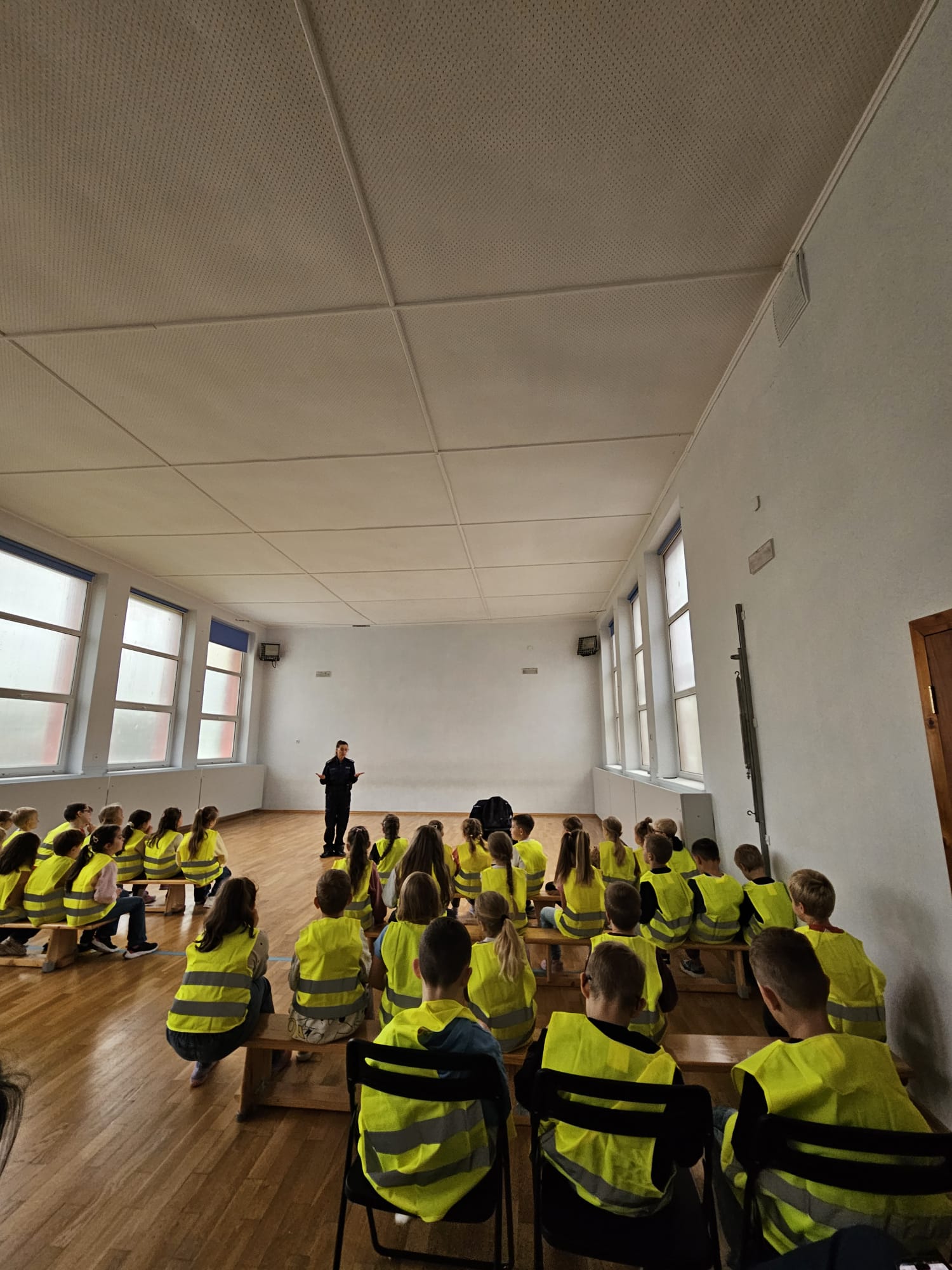 Podczas spotkania dzieci ubrane były w kamizelki odblaskowe, które są na wyposażeniu szkoły i wykorzystywane podczas wyjść i wycieczek uczniów. Dodatkowo szkoła zakupiła dla każdego ucznia zabawne gadżety odblaskowe.