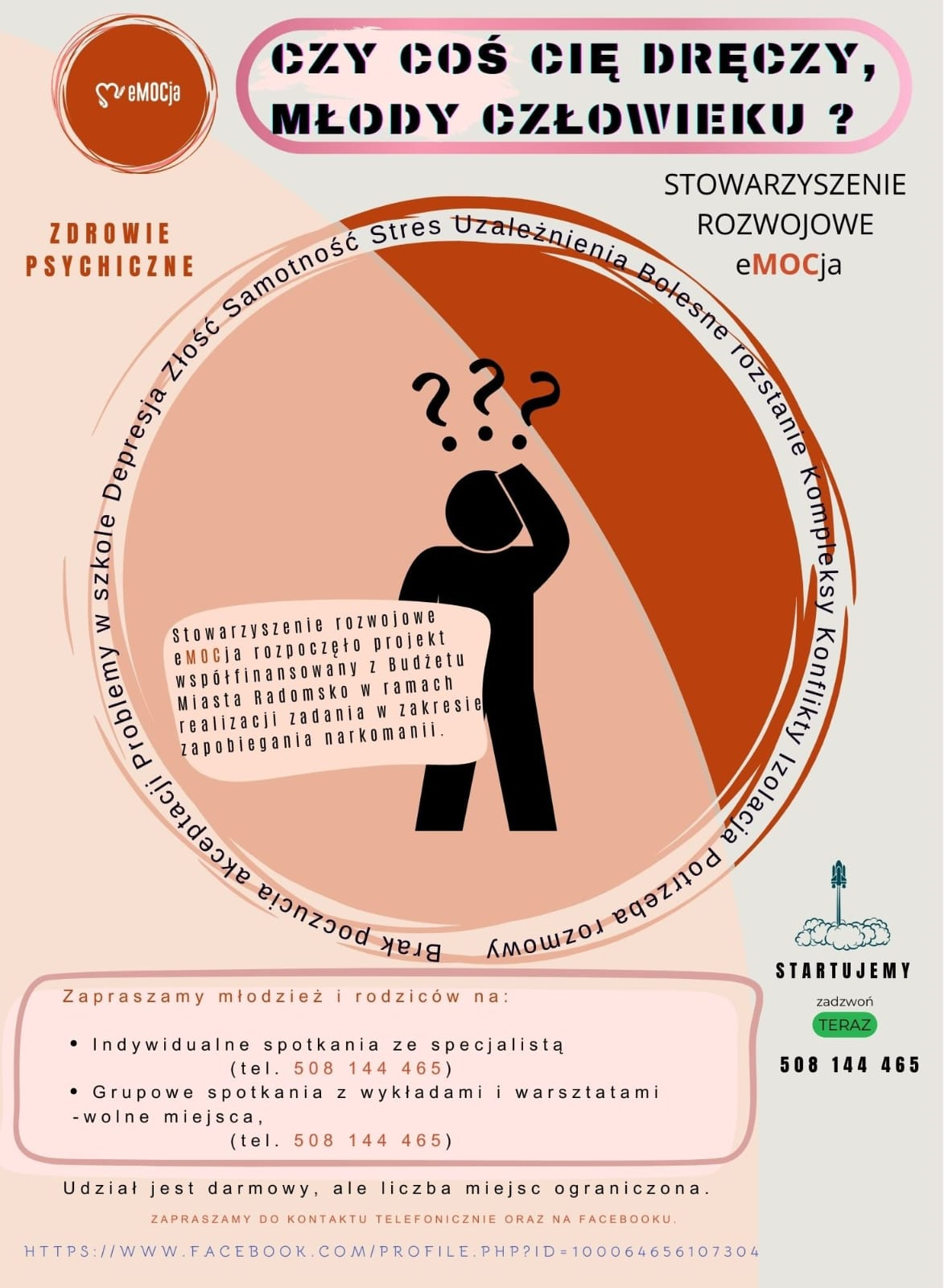 Stowarzyszenie Rozwojowe "e M O C j a " serdecznie zaprasza na darmowe spotkania dla młodzieży szkolnej i rodziców młodzieży szkolnej z Radomska.