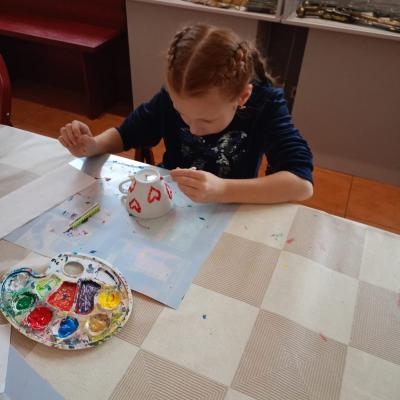 pt. "Z Gliny stworzone " oraz udziału w warsztatach zdobienia filiżanek. Dzieci z zaangażowaniem zdobiły pięknie swoje filiżanki gliny.